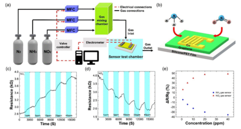 FiFig 4. 使用具有圖案化后銅接觸的石墨烯器件進行氣體傳感。(a) 氣體測試裝置示意圖。(b) 氣體分子(氨氣(NH?)和二氧化氮(NO?))與石墨烯器件之間相互作用的示意圖。(c) 電阻與氨氣濃度的關(guān)系。(d) 電阻與二氧化氮濃度的關(guān)系。(e) 歸一化電阻與氣體濃度的關(guān)系。