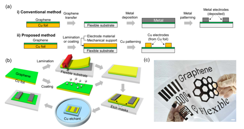 Fig 1. 利用生長后圖案化銅箔實現(xiàn)與石墨烯的電接觸。(a) 傳統(tǒng)方法與本研究所提方法在制造石墨烯基柔性電子產(chǎn)品時電接觸方式的對比。在傳統(tǒng)方法中,銅箔(即化學(xué)氣相沉積生長石墨烯的生長基底)在石墨烯轉(zhuǎn)移過程中被完全蝕刻(或分層剝離),隨后在石墨烯上沉積金屬以實現(xiàn)電接觸。而在本研究提出的方法中,銅箔被用作電極,通過將銅箔圖案化為所需的電極形狀,在無需在石墨烯上額外沉積金屬的情況下,實現(xiàn)與石墨烯的電接觸。(b) 利用生長后圖案化銅箔實現(xiàn)與石墨烯電接觸的制造工藝示意圖。(c) 在12.9英寸硅酮/聚對苯二甲酸乙二酯(PET)薄膜上制造的帶有生長后圖案化銅電極的石墨烯基柔性器件。比例尺:1厘米。