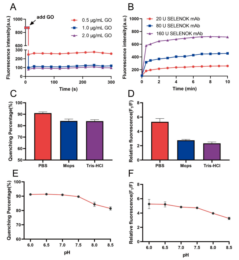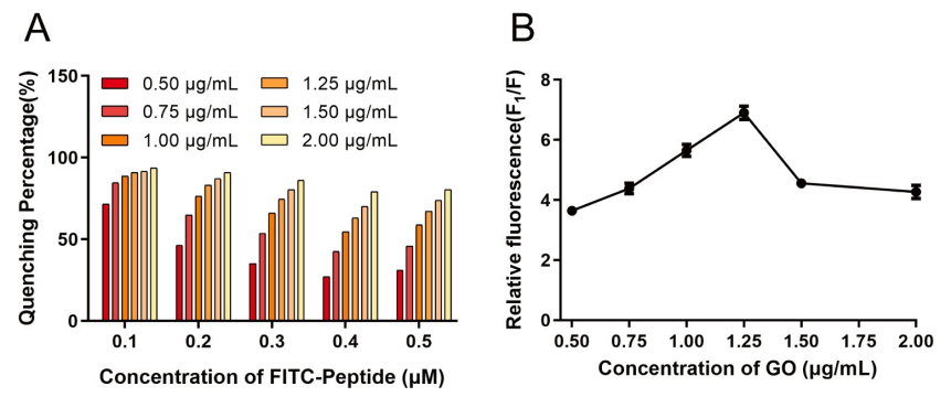 圖2. 反應(yīng)物濃度對檢測性能的影響。(A)在不同濃度的GO和FITC肽存在下,熒光強度發(fā)生變化。(B)FITC肽的熒光變化與GO濃度的關(guān)系。我們將添加GO后GO和FITC-肽復(fù)合物的熒光強度定義為F,然后,在存在SELENOK mAb的情況下,SELENOK/FITC-肽復(fù)合物的熒光強度定義為F1。