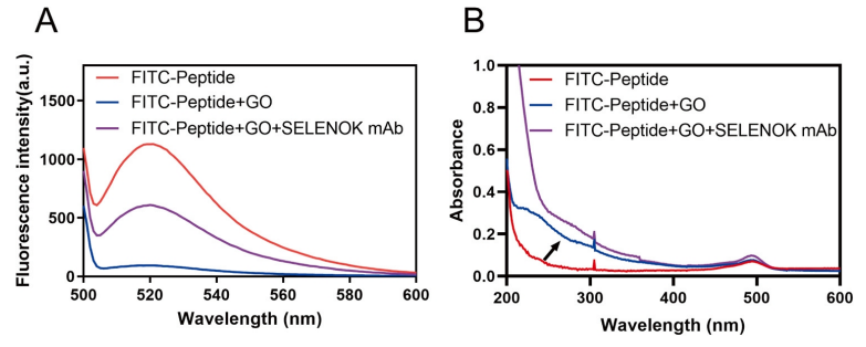 圖1. 基于FITC-肽/GO復(fù)合物檢測SELENOK mAb可行性。樣品的熒光發(fā)射光譜(A)和紫外-可見吸收光譜(B)。
