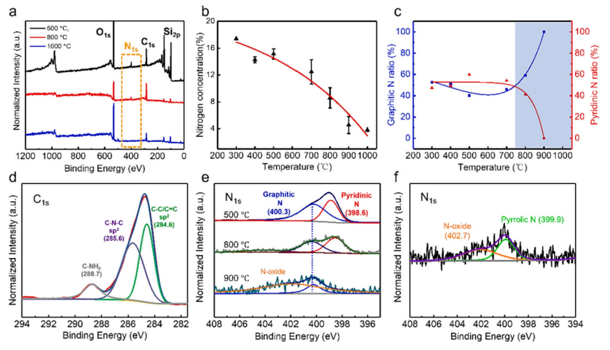 圖4. (a)在不同溫度下生長的N-摻雜石墨烯薄膜的譜;(b)溫度與氮摻雜劑濃度的關系。(c)石墨和吡啶含量隨溫度的變化(藍色區(qū)域指高溫情況下的不同生長機制)。(d)在500℃溫度下生長的N-摻雜石墨烯薄膜的C1s光譜,(e)在不同溫度下合成的N-摻雜石墨烯薄膜的N1s光譜。(f)在1000℃溫度下生長的N-摻雜石墨烯薄膜的N1s光譜表明不同的氮摻雜含量。