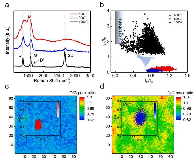 ID/IG比率的相關性(灰色區(qū)域指石墨烯)。(c) (d)在500℃和800℃的溫度下生長的薄膜的拉曼映射圖像,插圖為相應的分布圖。