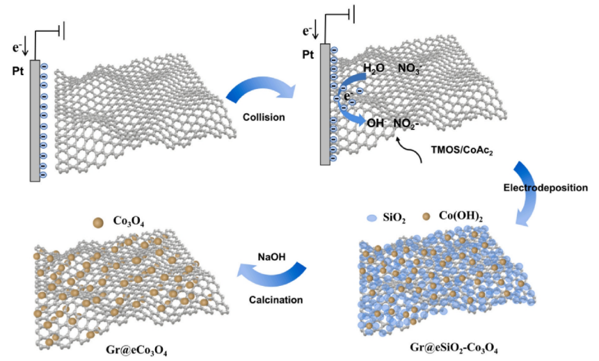 圖1. 石墨烯納米片上四氧化三鈷電沉積示意圖。