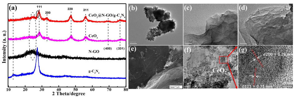 圖1.所制備樣品的XRD圖譜(a)。CeO?的TEM圖像(b),N-GO的TEM圖像(c)和g-C?N?的TEM圖像(d)。CeO?@N-GO/g-C?N?的SEM圖像(e),TEM圖像(f)和相應(yīng)的HR-TEM圖像(g)。