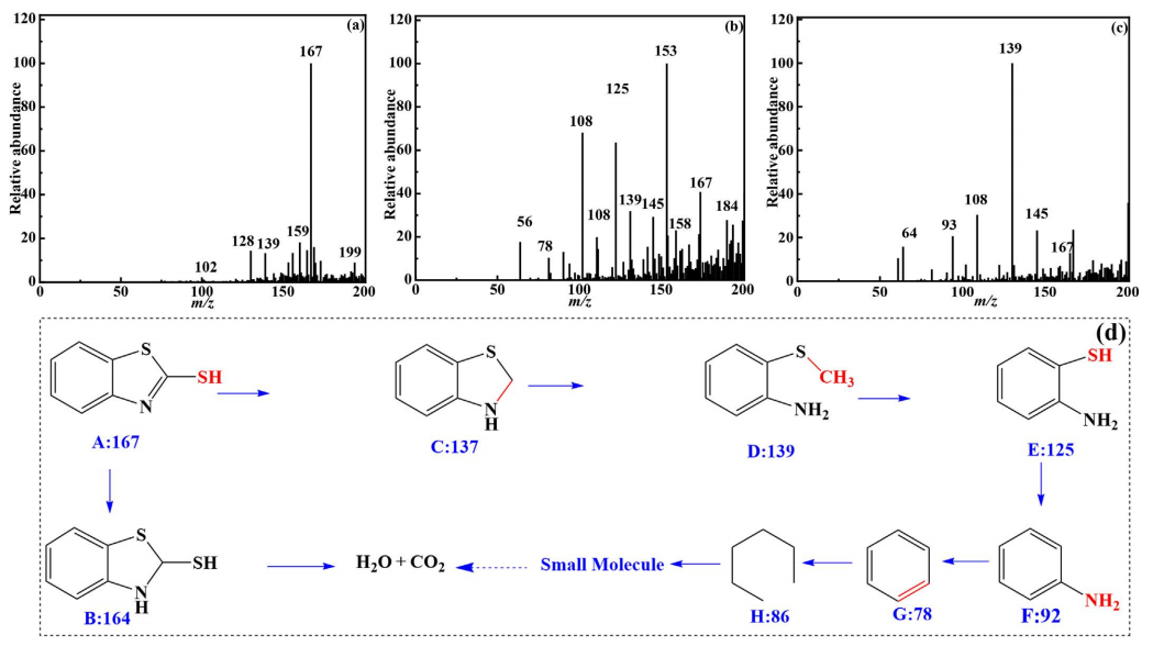 圖6。MBT降解的m/z:初始溶液(a),60分鐘(b)和120分鐘(c)。在CeO2@N-GC g-C3N4上降解MBT過程中產(chǎn)生的不同種類的中間產(chǎn)物(d)。