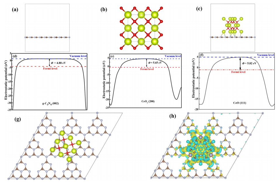 圖8。g-C3N4(a)和CeO2(b)的頂視圖和側(cè)視圖。g-C3N4(c)和CeO2(d)的逸出功。CeO2/g-C3N4的電荷密度差(e,頂視圖和側(cè)視圖)(黃色等值面:電子積累,藍色等值面:電子耗盡,等值面值為0.002 e Å^-3)。