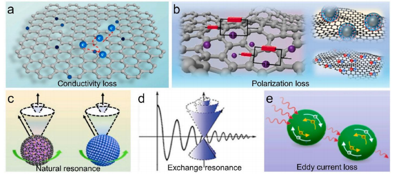 圖1. 電磁波吸收的主要介電和磁損耗機(jī)制。(a) 電導(dǎo)損耗。經(jīng)許可轉(zhuǎn)載自參考文獻(xiàn)。(b) 極化損耗。經(jīng)許可轉(zhuǎn)載自參考文獻(xiàn)[34,35]。(c) 自然共振。經(jīng)許可轉(zhuǎn)載自參考文獻(xiàn)。(d) 交換共振。經(jīng)許可轉(zhuǎn)載自參考文獻(xiàn)。(e) 渦流損耗。經(jīng)許可轉(zhuǎn)載自參考文獻(xiàn)。