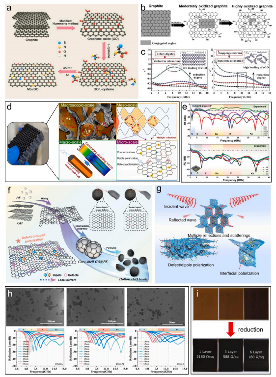 圖3。石墨烯氧化物(GO)和還原石墨烯氧化物(r-GO)用于微波吸收。(a) 從石墨到GO和r-GO的過程示意圖。經(jīng)Ref. 許可轉(zhuǎn)載。(b) 氧化共軛區(qū)域的示意圖。經(jīng)Ref. 許可轉(zhuǎn)載。(c) 低負(fù)載和高負(fù)載r-GO的介電損耗機(jī)制。經(jīng)Ref. 許可轉(zhuǎn)載。(d) 用于微波吸收的蜂窩狀r-GO復(fù)合材料。經(jīng)Ref. 許可轉(zhuǎn)載。(e) r-GO海綿超結(jié)構(gòu)的微波反射損耗(RL)曲線。經(jīng)Ref. 許可轉(zhuǎn)載。(f) 中空r-GO碗的制備過程和缺陷演變。經(jīng)Ref. 許可轉(zhuǎn)載。(g) r-GO氣凝膠的電磁波衰減機(jī)制。經(jīng)Ref. 許可轉(zhuǎn)載。(h) 不同片層大小的r-GO的掃描電子顯微鏡(SEM)圖像和反射損耗(RL)。經(jīng)Ref. 許可轉(zhuǎn)載。(i) 打印的GO和r-GO層壓板。經(jīng)Ref. 許可轉(zhuǎn)載。