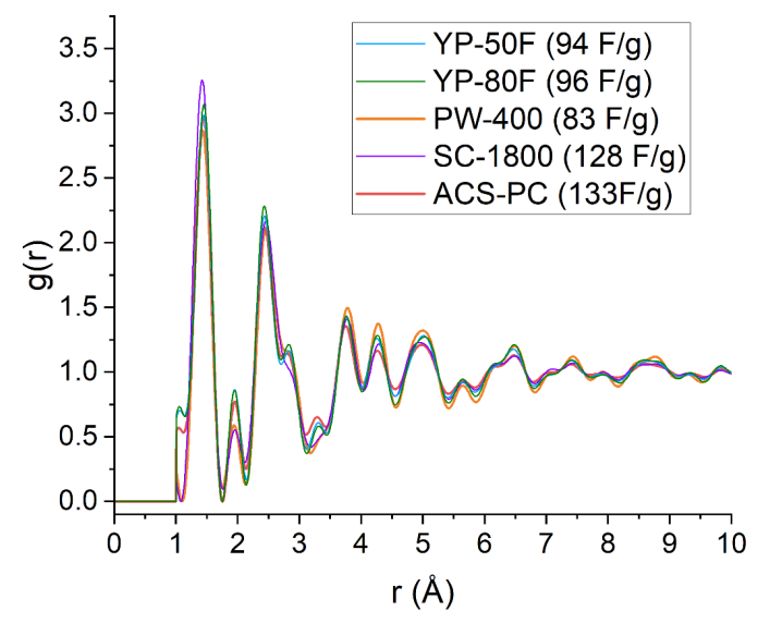 圖 S20:五種商用活性炭(YP-50F、YP-80F、PW-400、SC-1800和ACS-PC,電容值已標(biāo)注)的重新歸一化對(duì)分布函數(shù)(PDF)g(r)對(duì)比。