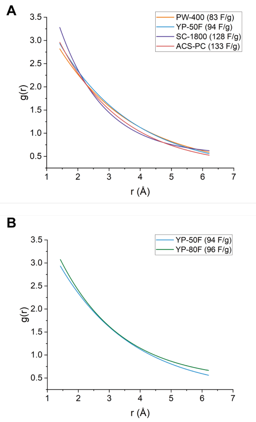 (A) 四種具有相似孔徑分布的商用活性炭(PW-400、YP-50F、SC-1800和ACS-PC,電容值已標(biāo)注)的X射線PDF圖譜對(duì)比。