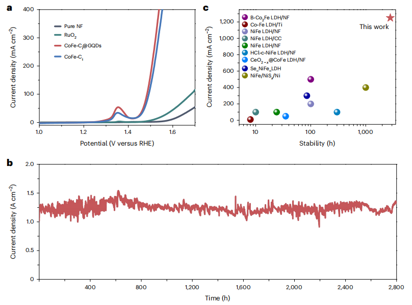 b. CoFe-Ci@GQDs/NF在堿性模擬海水(2.0 V vs. RHE)中連續(xù)運行2800小時的穩(wěn)定性測試。