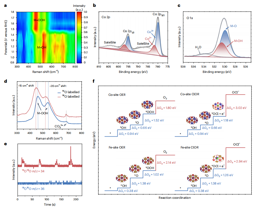 e. 電化學(xué)處理后的¹?O標(biāo)記CoFe-Ci@GQDs/NF在1.6 V(vs. RHE)極化時,³?O?與³?O?的微分電化學(xué)質(zhì)譜(DEMS)信號隨時間變化曲線。