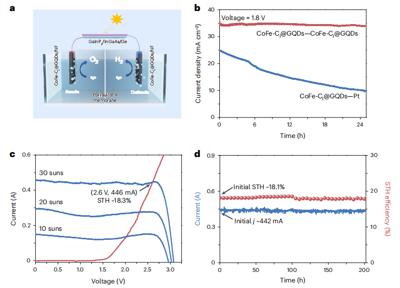 d. 基于三結(jié)太陽能電池(GaInP?/InGaAs/Ge)供電的CoFe-Ci@GQDs/NF–CoFe-Ci@GQDs/NF電解槽在30倍太陽光強下的電流-時間(i–t)曲線及對應(yīng)太陽能-氫氣(STH)轉(zhuǎn)化效率曲線(光照面積:1 cm²;電極面積:1 cm²)。