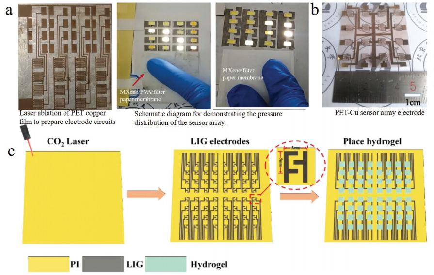 b) 用于MXene基傳感陣列的4×4像素電極陣列的激光加工示意圖;