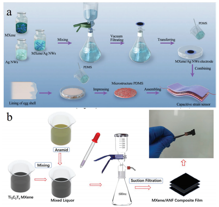 b) 層狀MXene/ANF復(fù)合傳感器的制備流程示意圖。
