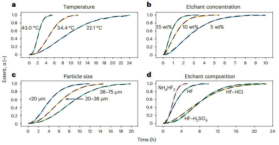圖1 | Ti3AlC2 MAX相蝕刻反應(yīng)的蝕刻程度-時(shí)間動(dòng)力學(xué)曲線。a–d分別展示了不同參數(shù)變化下的實(shí)驗(yàn)結(jié)果:溫度(a)、HF蝕刻劑濃度(以wt%表示,對應(yīng)2.89、5.78和8.67 M三種濃度)(b)、Ti3AlC2 MAX顆粒尺寸(c)以及蝕刻劑成分(d)。虛線表示通過Avrami-Erofe’ev(n非固定)模型擬合的曲線。本圖經(jīng)美國化學(xué)會(huì)授權(quán)改編自參考文獻(xiàn)。