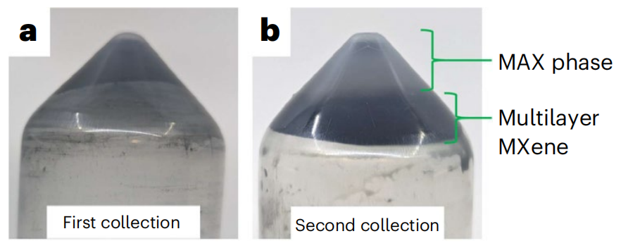 圖4 | 剝離后沉積物的膨脹現(xiàn)象表征剝離效果。a、b分別為剝離收集階段沉積物的動(dòng)態(tài)變化:當(dāng)單層MXene開始剝離時(shí),沉積物會(huì)逐漸膨脹。此時(shí)上清液含有單層MXene,而沉積物包含未蝕刻的MAX相和多層MXene混合物。首次離心收集(a)的沉積物呈深色,系MAX相與多層MXene的混合體;經(jīng)重新分散和二次離心后(b),沉積物呈現(xiàn)部分膨脹狀態(tài),顯示未蝕刻MAX相與多層MXene的初步分離。本圖展示的是Ti3C2Tx材料經(jīng)LiCl剝離處理后的實(shí)驗(yàn)結(jié)果。