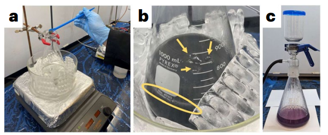 圖8 | MAX相鹽酸洗滌工藝流程。a-c依次展示:9M HCl洗滌液配置階段,重點(diǎn)呈現(xiàn)磁力攪拌器參數(shù)設(shè)置與粉末投加量控制(a);反應(yīng)進(jìn)行中產(chǎn)生氣泡的黃色高亮區(qū)域(b),需通過降低MAX相粉末投加速度控制發(fā)泡強(qiáng)度;采用真空過濾裝置實(shí)現(xiàn)酸液與MAX相粉末分離(c),濾液因溶出雜質(zhì)呈現(xiàn)紫色。不同批次MAX相粉末可能因雜質(zhì)成分差異呈現(xiàn)不同顏色特征。