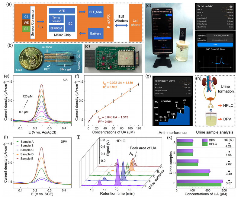 i) 尿液樣本中UA檢測的DPV曲線與j) 高效液相色譜(HPLC)對照譜圖;