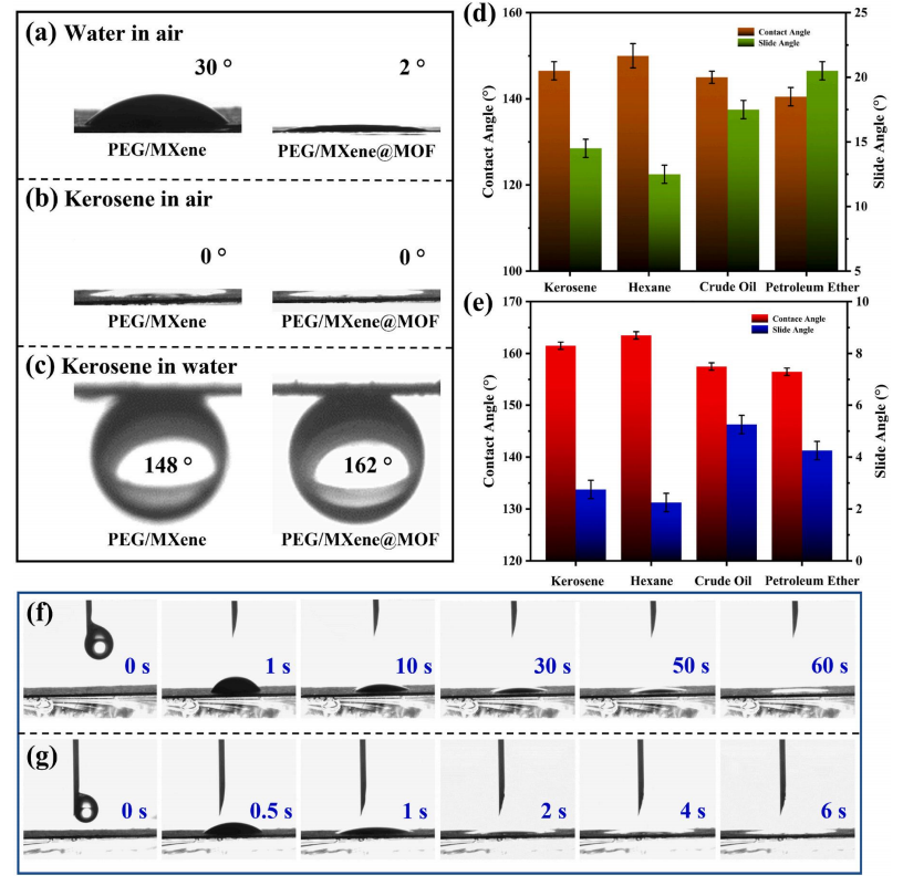 (a) 水和煤油滴在空氣中的潤(rùn)濕性對(duì)PEG/MXene和PEG/MXene@MOF膜的影響:
