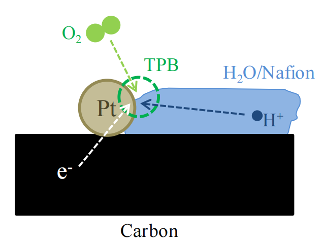 圖1.2. 質子交換膜燃料電池(PEMFC)陰極中發(fā)生氧還原反應(ORR,反應1.2)的三相邊界(TPB)示意圖。