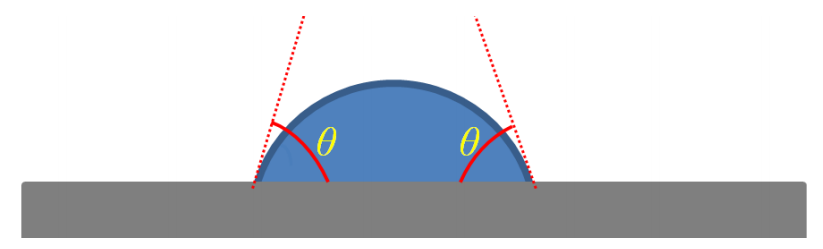 圖1.3. 水滴(藍色)在平坦樣品表面(灰色)的接觸角(θ)示意圖。