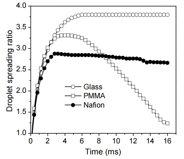 圖3.2. 水滴撞擊裸玻璃、聚甲基丙烯酸甲酯(PMMA)及全氟磺酸樹脂(Nafion)表面的實驗鋪展率(公式3.1)
