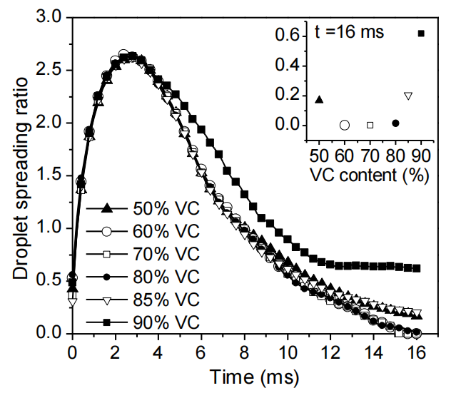 圖3.5. 水滴撞擊火山碳(VC)/全氟磺酸樹脂(Nafion)復合基底表面(50–90 質量分數(shù))的實驗鋪展率。插圖為 t = 16 毫秒時刻的鋪展率數(shù)據(jù)。