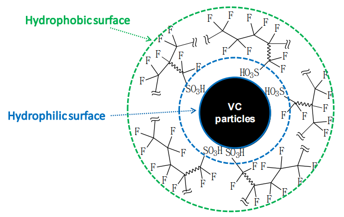 圖3.6. 全氟磺酸樹脂(Nafion)在火山碳(VC)顆粒表面的取向結構示意圖