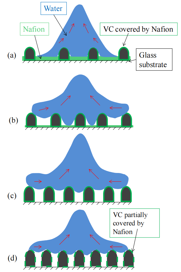 圖3.8. 水滴(藍色)撞擊不同比例火山碳(VC)/全氟磺酸樹脂(Nafion)復合材料表面后的回縮過程示意圖。(a) 30% VC/Nafion、(b) 40% VC/Nafion、(c) 60% VC/Nafion、(d) 90% VC/Nafion。圖中捕捉了水滴在 t = 6.4 毫秒時的動態(tài)(如圖3.1所示),展示了水滴與碳基/Nafion復合表面間的相互作用。紅色箭頭表示水滴的運動方向。