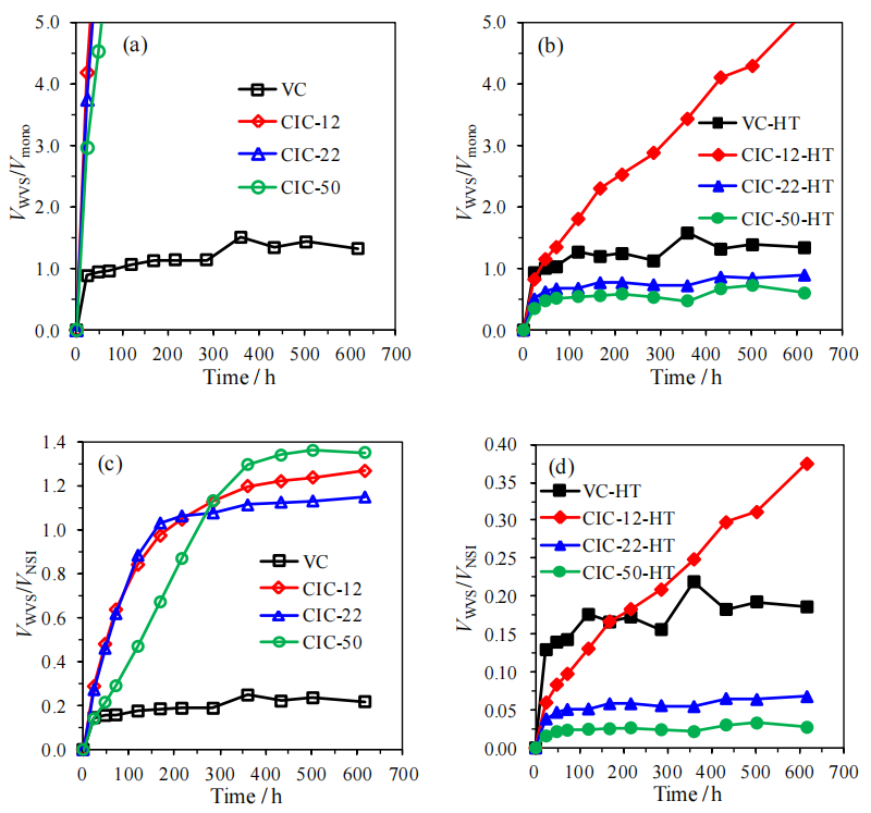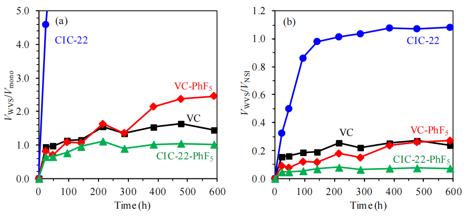 圖6.5. 五氟苯基(-PhF5)基團表面功能化前后VC與CIC-22材料在室溫水蒸氣環(huán)境中的水蒸氣吸附(WVS)數(shù)據(jù)
