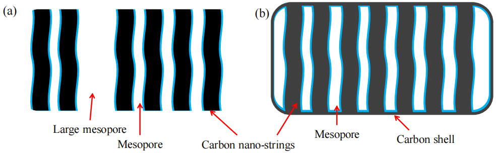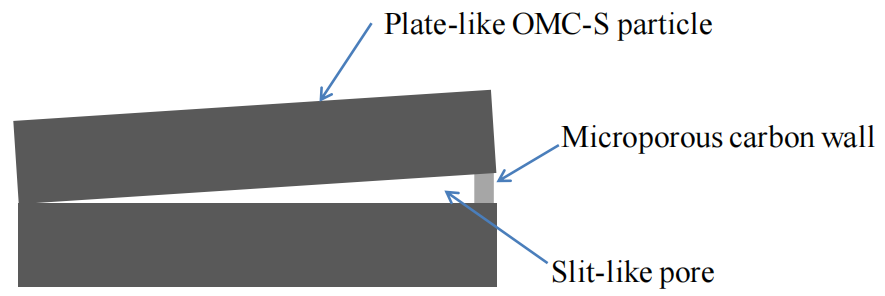 狹縫型孔道(slit-like pore)的形成可能與OMC-S顆粒的團聚堆積有關,微孔碳壁(microporous walls)兼具結構支撐與傳質限制的雙重作用;
