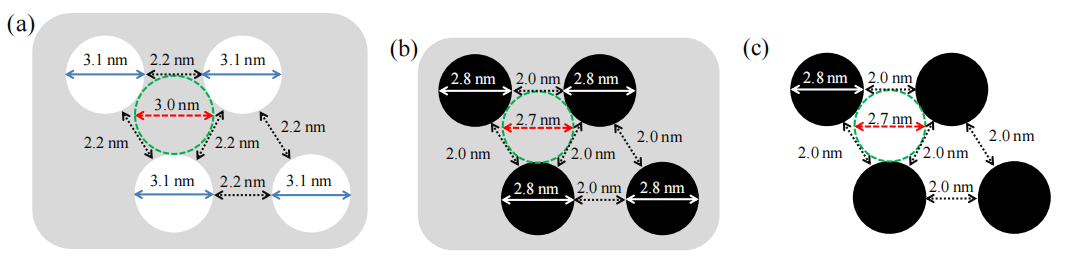 圖5.5. (a) 六方介孔二氧化硅(HMS, 灰色)模板的孔隙(白色圓)與孔壁截面尺寸示意圖(該模板用于合成有序介孔碳OMCs)[49, 132];(b) 碳前驅體填充的HMS模板(a)經(jīng)高溫(900°C)熱處理后,孔隙內填充碳納米鏈(黑色圓)的截面尺寸示意圖;(c) 移除二氧化硅模板后(b),OMCs孔隙的截面尺寸示意圖。綠色虛線圓(a-c)與其外圍三個圓相切,分別表征HMS模板的二氧化硅壁厚度(a-b)或相鄰碳納米鏈之間的孔隙尺寸(c);箭頭(a-c)表示圓的直徑或兩圓邊緣之間的間隙距離。