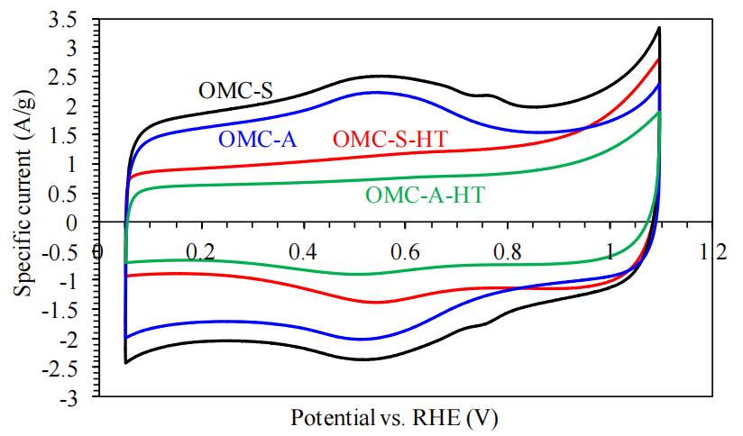 圖4.10. 不同碳材料的循環(huán)伏安(CV)性能對比。VC(未熱處理)、VC-HT(熱處理)、CIC-22(未熱處理)及CIC-22-HT(熱處理)在氮氣飽和的0.5 M H<sub>2</sub>SO<sub>4</sub>水溶液中的循環(huán)伏安曲線,掃描速率為10 mV/s。