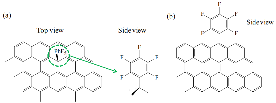 平面石墨烯(圖a):C-C單鍵可能通過芳環(huán)平面上的sp²碳與-PhF5基團形成定向共價連接,受表面π電子云分布影響;