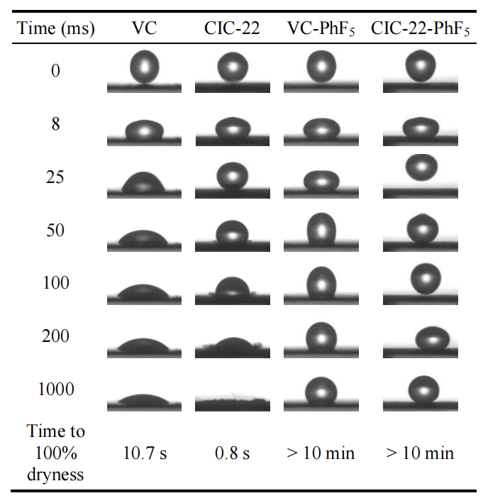 接觸角為180°表示水滴已從樣品表面完全反彈(例如圖6.3中CIC-22-PhF5樣品在t=25 ms時的狀態(tài))。