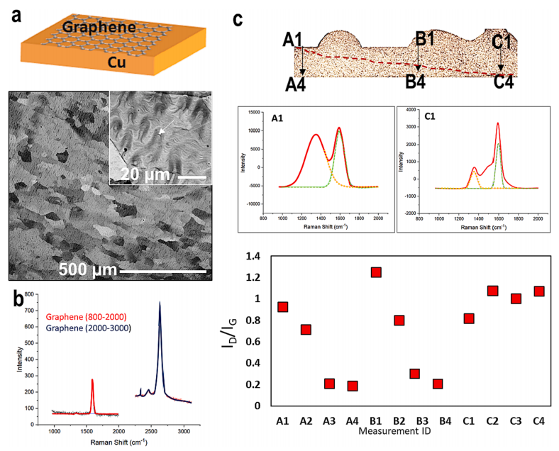 (a) 示意圖與背散射衍射圖像:展示通過(guò)化學(xué)氣相沉積(CVD)在銅箔表面覆蓋石墨烯層的工藝,以及石墨烯涂層導(dǎo)致的銅晶粒和表面波紋形貌;
