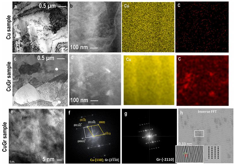 圖8. 銅(Cu)與銅-石墨烯(Cu-Gr)擠壓材的透射電鏡(TEM)表征結(jié)果: