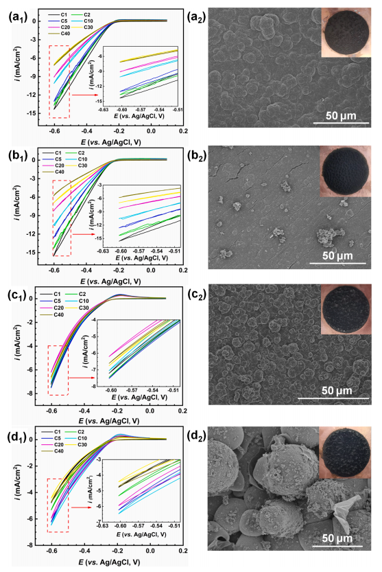 圖2.不同PPy涂層在銅上電聚合的伏安曲線(左:a: PPy;b: PPy-Ti;c: PPy-S;d: PPy-STi)以及新制備的形貌(右,插圖:光學(xué)圖像)。