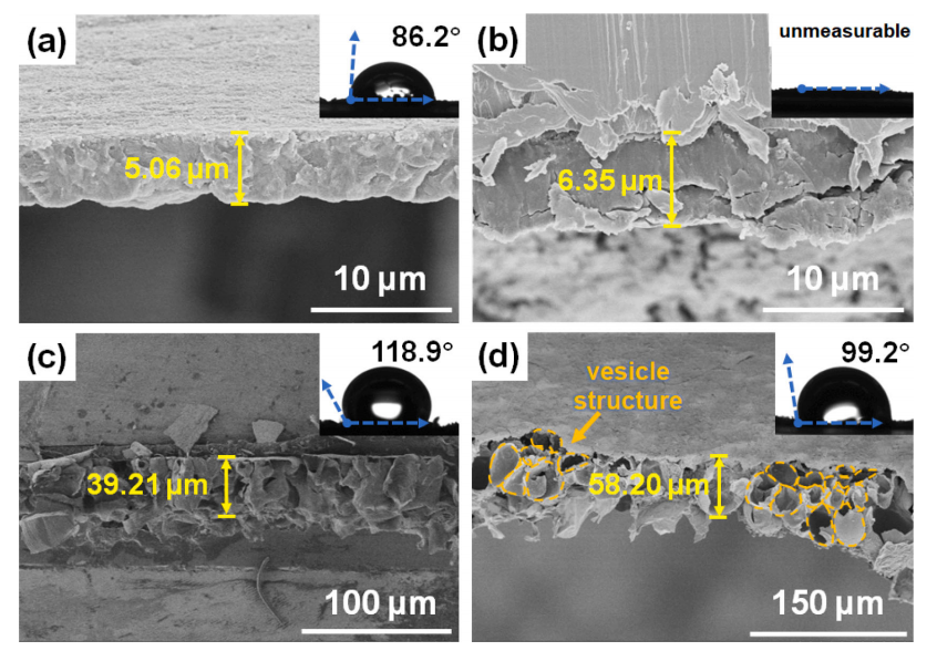 圖3.自由站立PPy(a)、PPy-Ti(b)、PPy-S(c)和PPy-STi(d)層的橫截面形態(tài)及其相應(yīng)的潤濕性(插圖)。