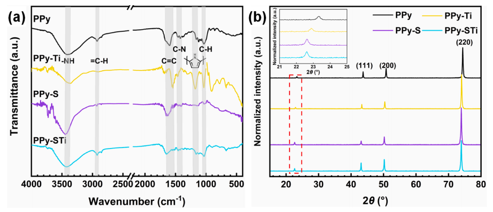 圖4.PPy、PPy-Ti、PPy-S和PPy-STi涂層的FTIR光譜(a)和XRD圖譜(b)。