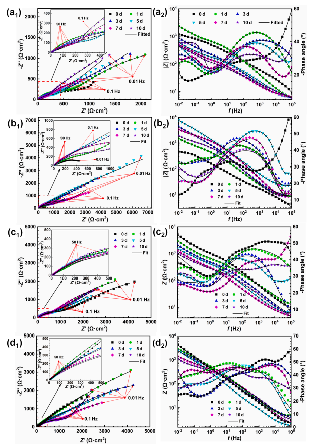圖7.在298 K下在ASW中分配浸泡時(shí)間后,PPy(a)、PPy-Ti(b)、PPy-S(c)和PPy-STi(d)涂層銅的Nyquist(左)和Bode(右)譜。