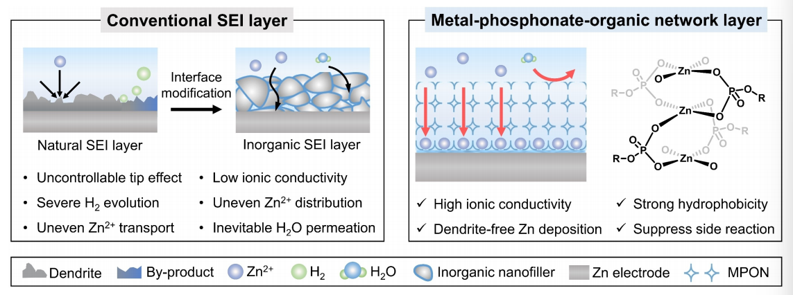 Scheme 1. 不同界面層的結構及鋅沉積行為示意圖。左:采用常規(guī)固體電解質界面(SEI)層保護的鋅金屬電極中的鋅沉積行為,包括自然SEI層和無機納米填料層。右:金屬-膦酸酯-有機網絡(MPON)層優(yōu)化的離子傳輸行為及其對應的Zn位點局部配位環(huán)境。