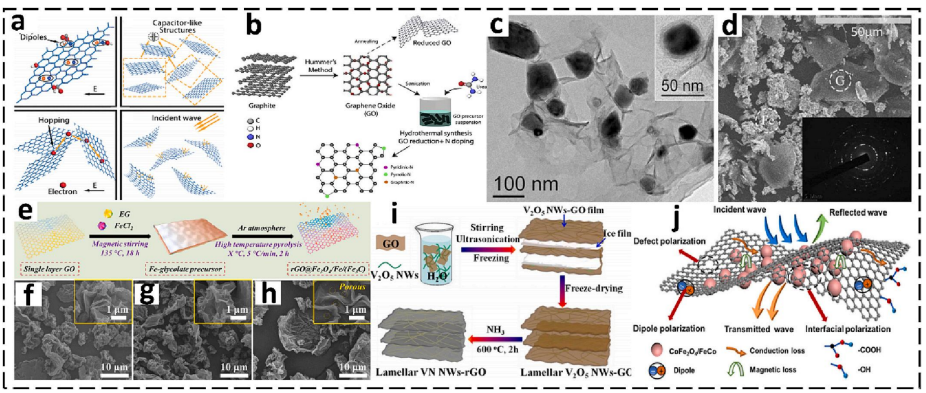 | c-d | Fe/石墨烯核殼結(jié)構(gòu) | 石墨烯包覆Fe納米顆粒(≈20 nm) | 抑制渦流損耗,界面電荷積累增強(qiáng)極化弛豫 |
