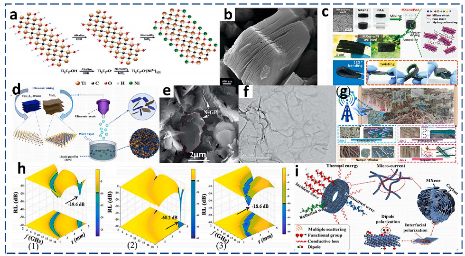 | a-b | Ni修飾Ti?C?T? MXene | 堿化擴(kuò)層+Ni納米顆粒錨定(≈10 nm) | Ni顆粒增強(qiáng)磁損耗,表面-OH官能團(tuán)促進(jìn)極化弛豫 |