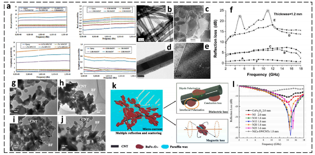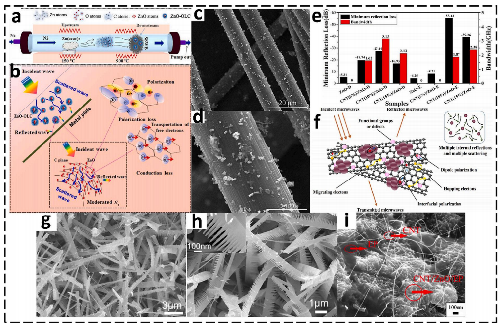 | f | CNT/ZnO復(fù)合材料 | CNT表面負(fù)載ZnO納米針(長度1–2 μm) | 協(xié)同損耗:CNT導(dǎo)電網(wǎng)絡(luò)+ZnO偶極極化 |