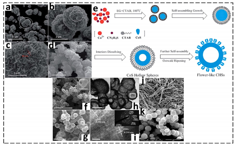 | f-i | 鈷微納結(jié)構(gòu) | 枝晶→花瓣分級(jí)組裝 | 尖銳邊緣激發(fā)局域電場(chǎng),增強(qiáng)介電極化損耗4 |