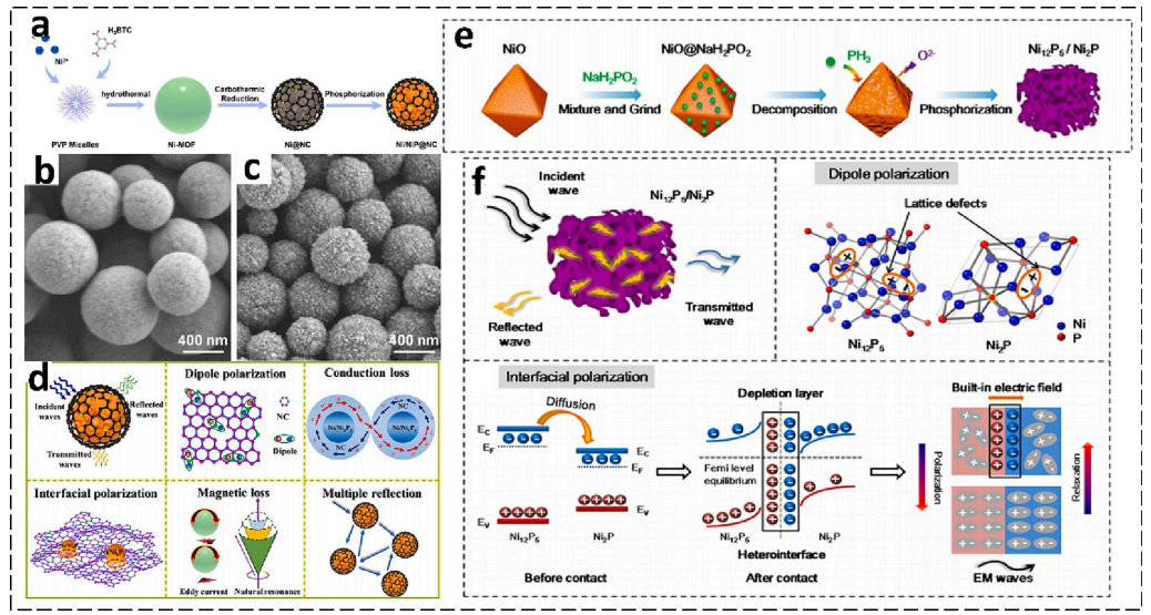 | d-e | NiS?@MoS?的SEM/TEM圖像 | NiS?核(直徑20–30 nm)外包覆MoS?殼(厚度≈5 nm),TEM證實(shí)清晰核殼界面;SEM顯示三維網(wǎng)絡(luò),抑制顆粒堆疊,界面極化提升C波段吸收711 |