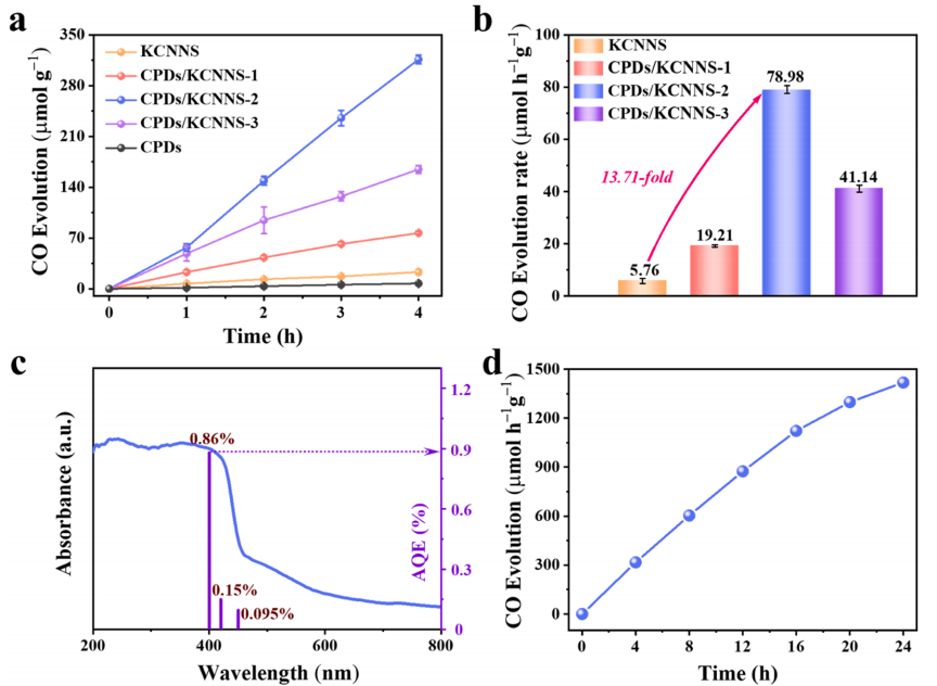 | (b) | CO產(chǎn)率對(duì)比 | 量化活性提升:CPDs/KCNNs相對(duì)原始KCNNs產(chǎn)率顯著增高(如CPDs/KCNNs-2或達(dá)3倍↑),證明異質(zhì)結(jié)增強(qiáng)電荷分離79 |