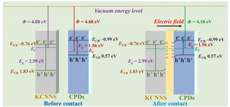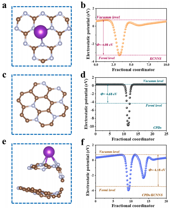 | (e)(f) | CPDs/KCNNs界面原子堆疊 | 界面功函數(shù)顯著降低(如≈4.0 eV) | 異質(zhì)結(jié)內(nèi)建電場(chǎng)形成:電子從KCNNs→CPDs自發(fā)轉(zhuǎn)移1011 |